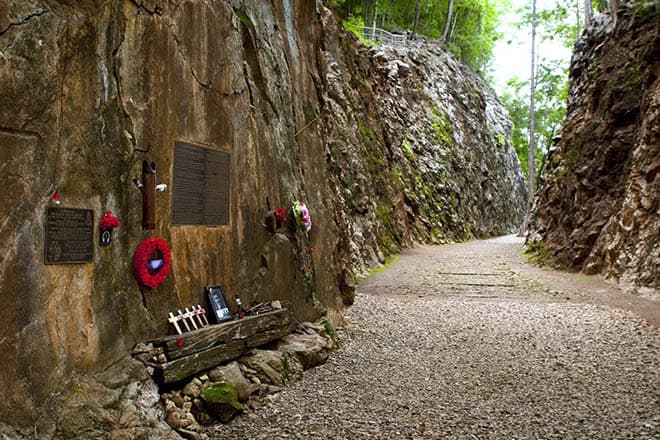 Eine bewegende Hommage an die Kriegsgefangenen, die die Todesbahn gebaut haben. Der Wanderweg durch den ausgehauenen Felsen ist eine demütigende Erfahrung.