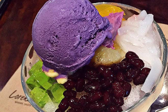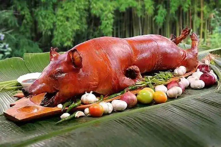 Probieren Sie unbedingtLechon(gebratenes Schwein) undAdobo(in Essig und Sojasauce geschmortes Schweinefleisch/Hühnchen). Bestellen Sie zum NachtischHalo-Halo, eine bunte Mischung aus geraspeltem Eis, Bohnen und Früchten.