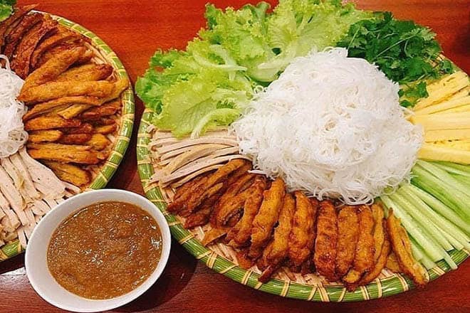 Die lokale Spezialität. Es handelt sich um ein DIY-Gericht mit frischen Frühlingsrollen, gegrilltem fermentiertem Schweinefleisch, knusprigem Reispapier und grüner Mango, das in eine reichhaltige Erdnusssauce getaucht wird. Probieren Sie es imDang Van Quyen.