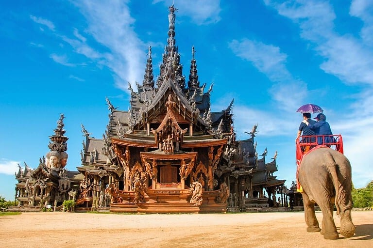 Besuchen Sie dasHeiligtum der Wahrheit, ein beeindruckendes riesiges Holzbauwerk, das vollständig von Hand und ohne einen einzigen Metallnagel geschnitzt wurde. Es ist ein architektonisches Wunderwerk direkt am Meer.