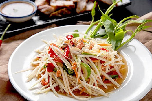 Som Tum (Papaya-Salat) mit gegrillten Flussgarnelen – ein Klassiker in Pattaya.
