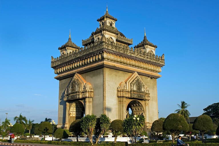 Vientianes Version des Arc de Triomphe. Steigen Sie auf die Spitze, um einen Panoramablick auf die grünen Alleen der Stadt zu genießen.
