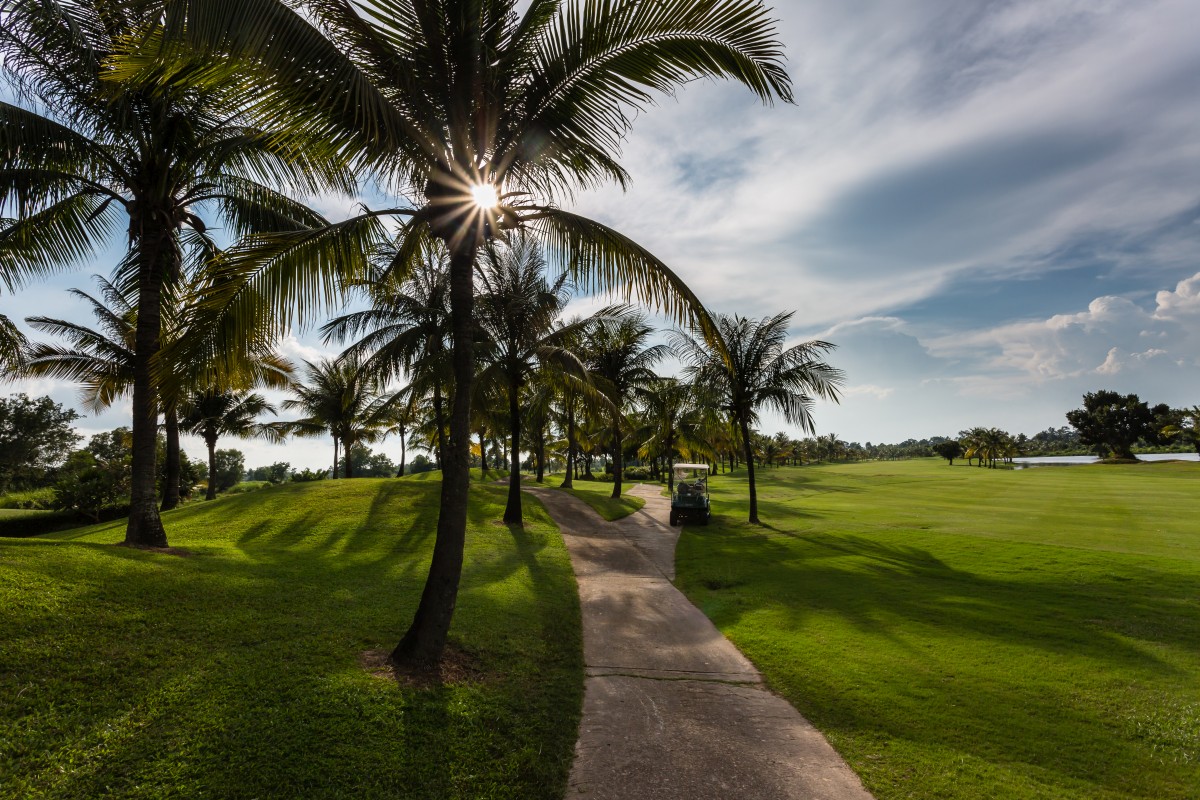 Der Club verfügt über zwei verschiedene Plätze: den Hill Course und den Lake Course. Der Hill Course ist bekannt für seine hügeligen Fairways und großen, hügeligen Grüns, die von majestätischen Ölpalmen eingerahmt werden. Im Gegensatz dazu stellt der Lake Course mit seinen hochgelegenen Bunkern und Wasserhindernissen an fast jedem Loch eine Herausforderung dar. Beide Plätze werden sorgfältig gepflegt, mit Paspalum-Gras auf den Fairways und Tifdwarf Bermuda auf den Grüns, was ein reibungsloses und gleichmäßiges Spiel gewährleistet.