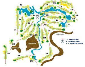 Der Lake Course ist nach seinem charakteristischen Par-4-Loch 3 benannt, das sich um einen kleinen See schlängelt, sowie nach dem Par-3-Loch 4, bei dem der See eine zentrale Rolle spielt. Die Anlage geht in einen klassischen Parkland-Stil über, mit sanften Wellen und bewaldeten Bereichen. Der Mountain Course fordert die Spieler mit seinen Höhenunterschieden heraus, schlängelt sich durch abschüssiges Gelände und bietet atemberaubende Ausblicke auf Kalksteinhügel.
