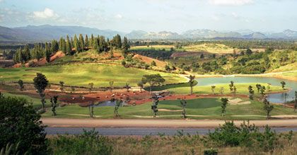 Die vorderen Neun schlängeln sich durch ein charmantes Bauernhaus, während sich die hinteren Neun über eine flache Landschaft mit atemberaubendem Bergblick erstrecken. Der Platz verfügt über mehrere Abschlagboxen für unterschiedliche Spielstärken, bietet aber auch zahlreiche Wasserhindernisse und Out-of-Bounds-Bereiche. Das erste Loch erfordert einen sicheren Drive über einen See, und das lange vierte Par-3-Loch ist selbst für die erfahrensten Golfer eine Herausforderung.