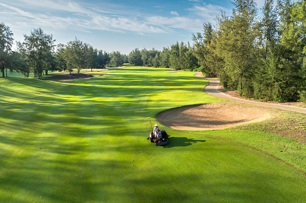 Vor der Kulisse des Vietnamesischen Ostmeeres und der Marmorberge fügt sich der Platz nahtlos in seine natürliche Umgebung ein. Das Layout im Links-Stil, das an traditionelle schottische Plätze erinnert, zeichnet sich durch hügelige Fairways, weitläufige Grüns und strategisch platzierte Bunker aus. Besonders hervorzuheben sind die Löcher 7 und 13 mit ihren anspruchsvollen tiefen Bunkern, die eine echte Herausforderung für das Können der Spieler darstellen.